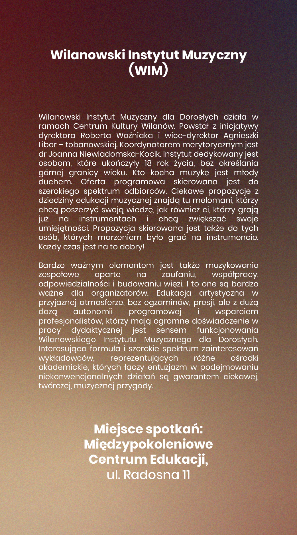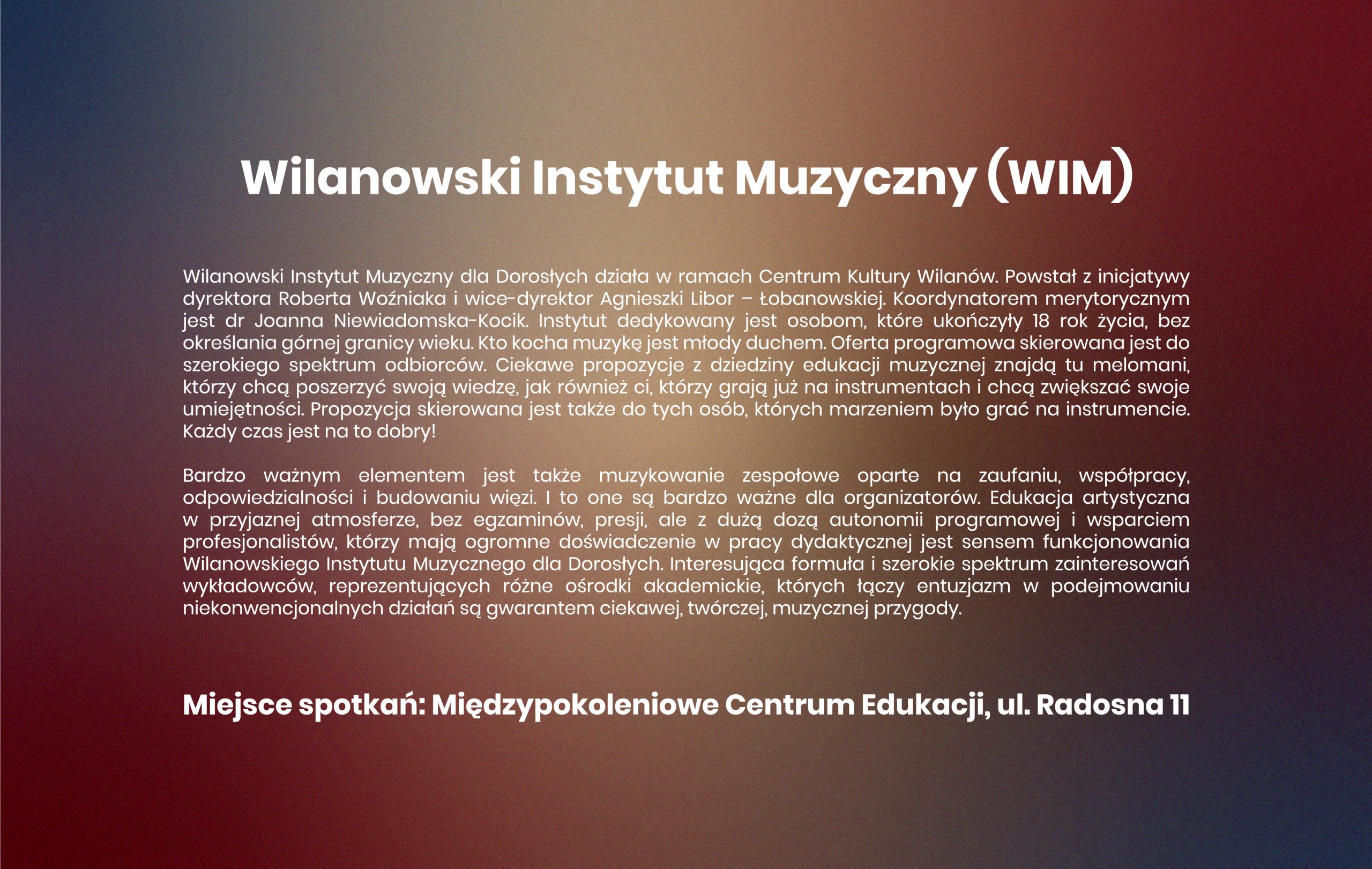Wilanowski Instytut Muzyczny to projekt nowatorski, ale zakorzeniony w lokalności. Tworząc przestrzeń do spotkań z muzyką, nauką i sztuką, pragniemy inspirować, edukować i jednoczyć mieszkańców Wilanowa oraz wszystkich, którym bliska jest potrzeba ciągłego rozwoju. Wierzymy, że poprzez lokalne działania możemy mieć realny wpływ na kształtowanie trendów w szeroko rozumianej kulturze.